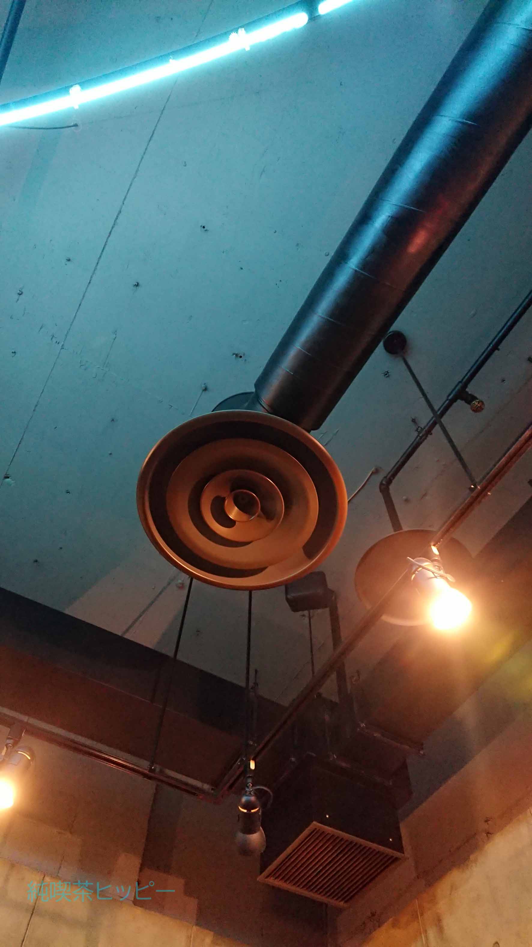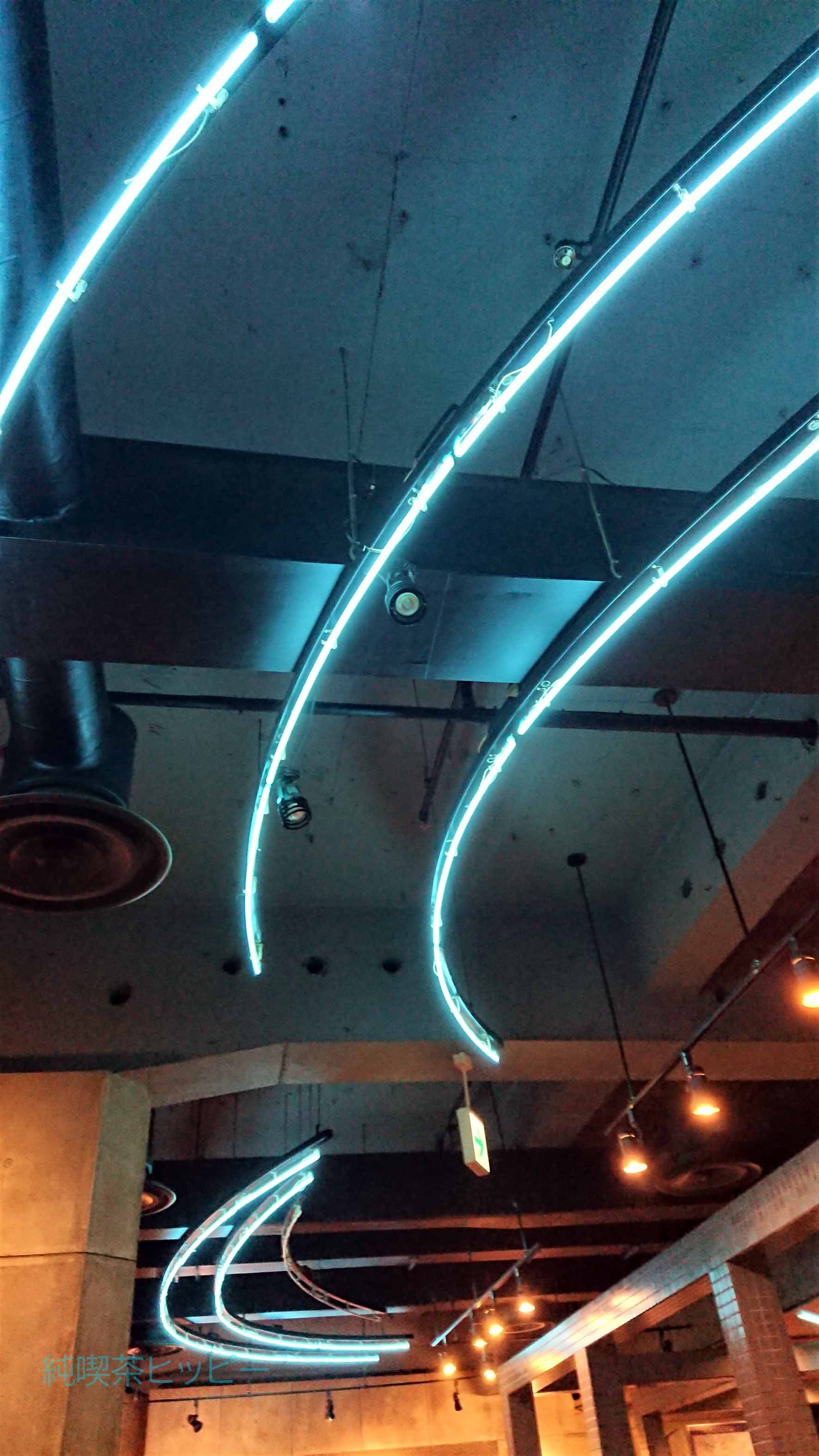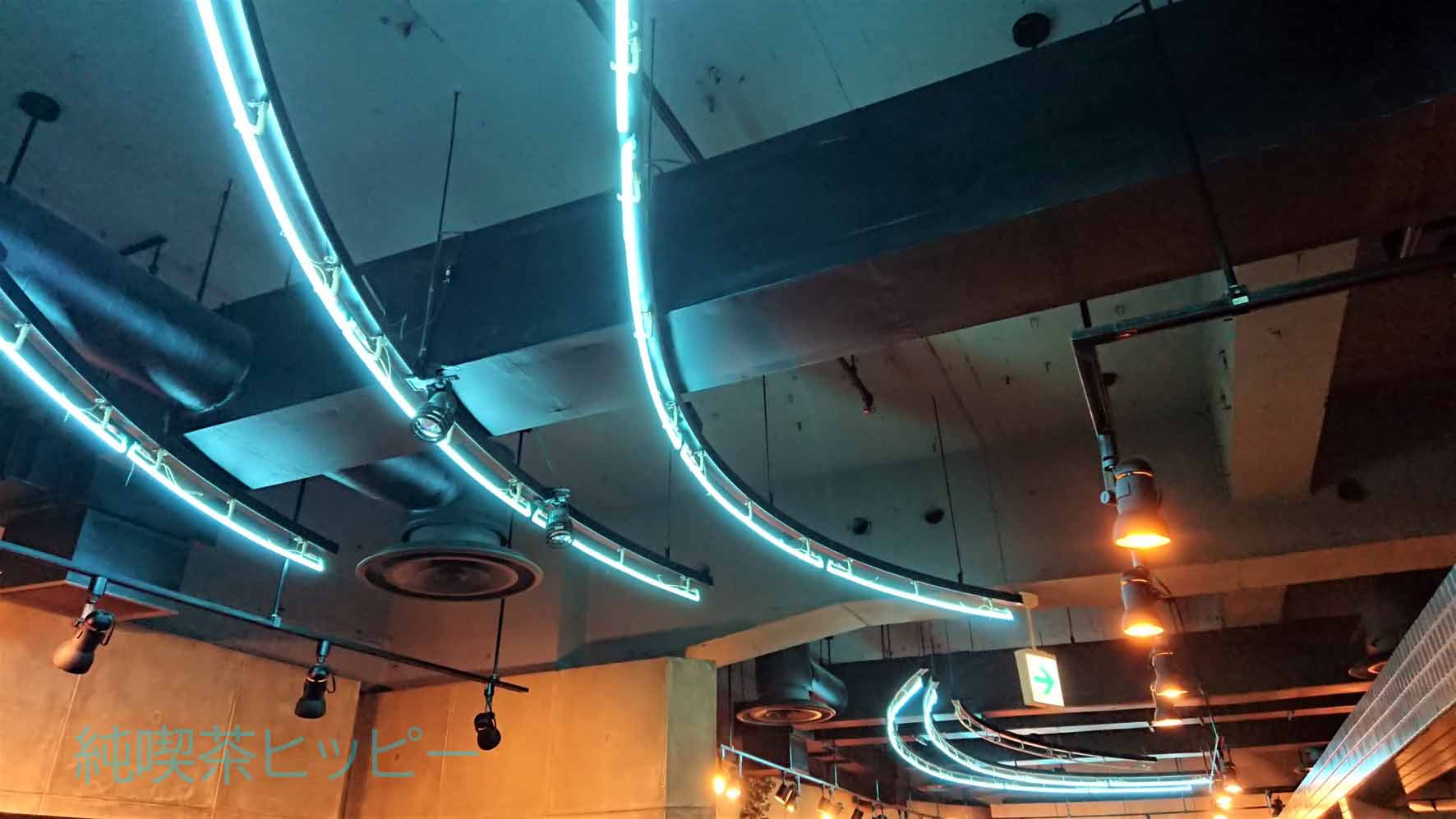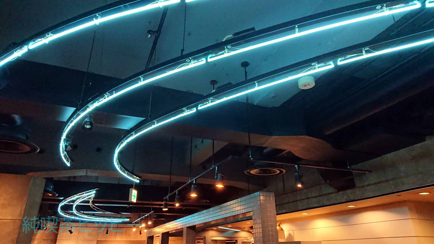 天井には青く光る芸術的なネオン管。緩いカーブで三本流れている雰囲気のある演出。