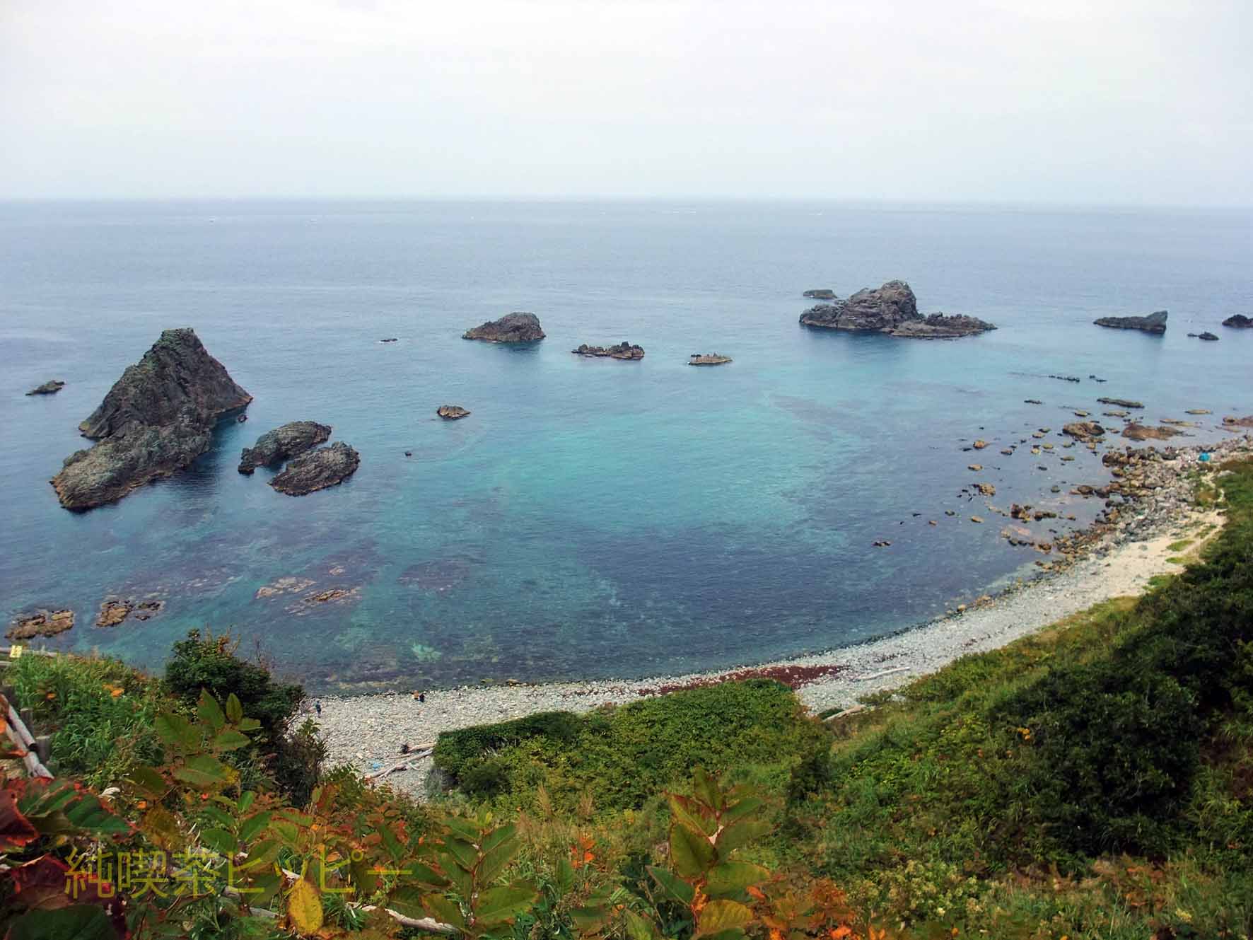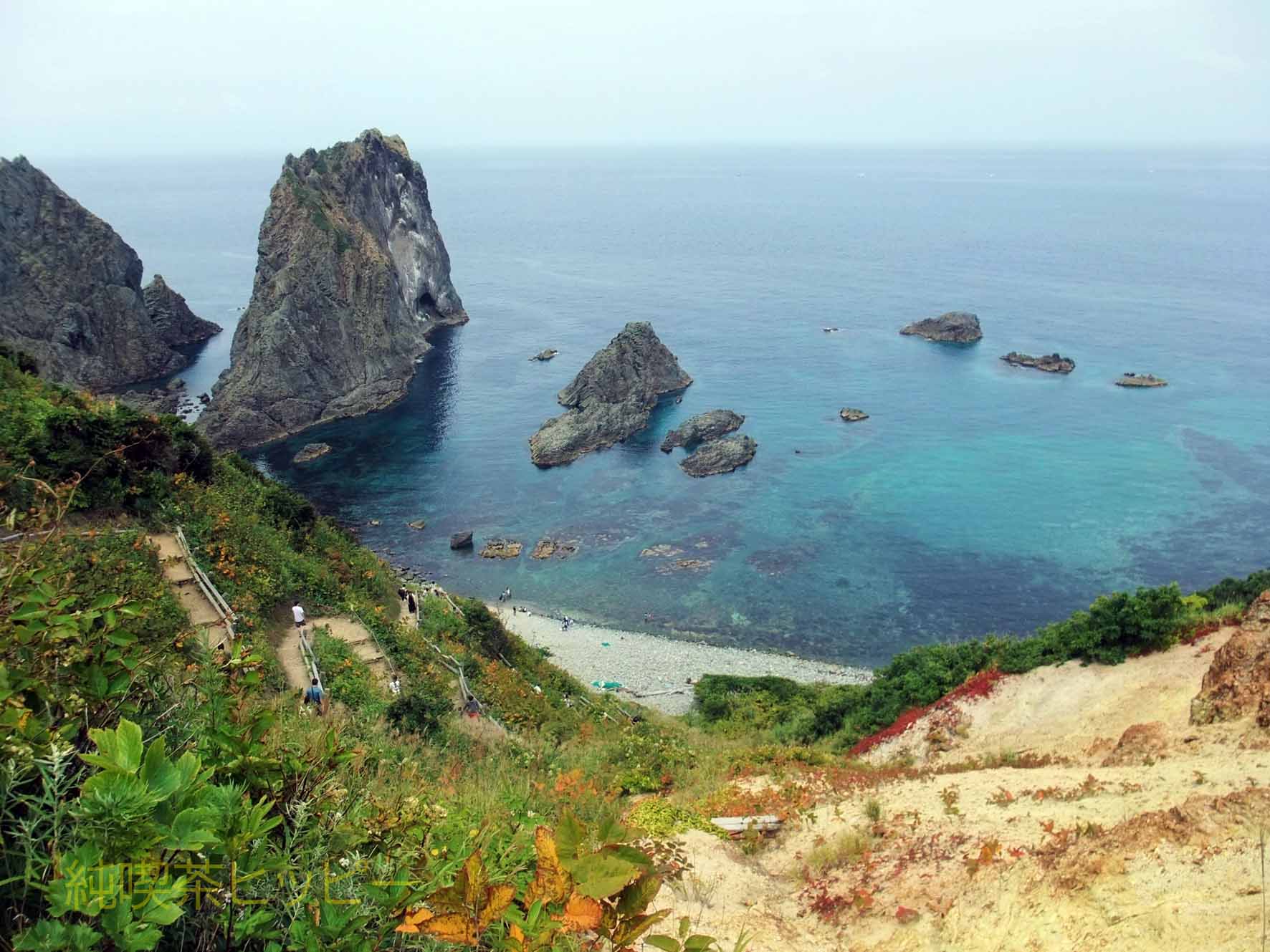 積丹ブルーと呼ばれる非常に鮮明な青と緑や複雑な濃さの青が浅瀬一面に広がる海。