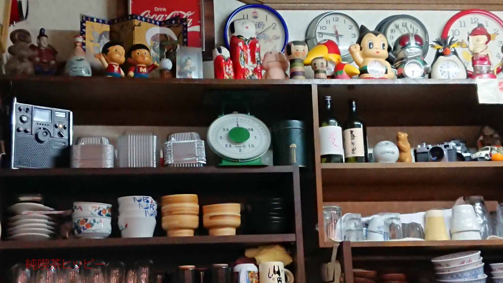 食器棚の隅には懐かしのBCLラジオ(ソニーのスカイセンサーかな)。やん坊まー坊の人形や、ほかの場所には「あしたのジョー」の額もあって、眺めていると楽しい。