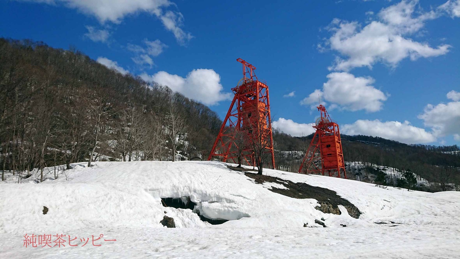 下は、白い雪と青空に映える三菱美唄炭鉱立坑巻き揚げ櫓