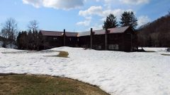 大量の雪解け水、小川の水が流れ込み、完全に水没の校舎。