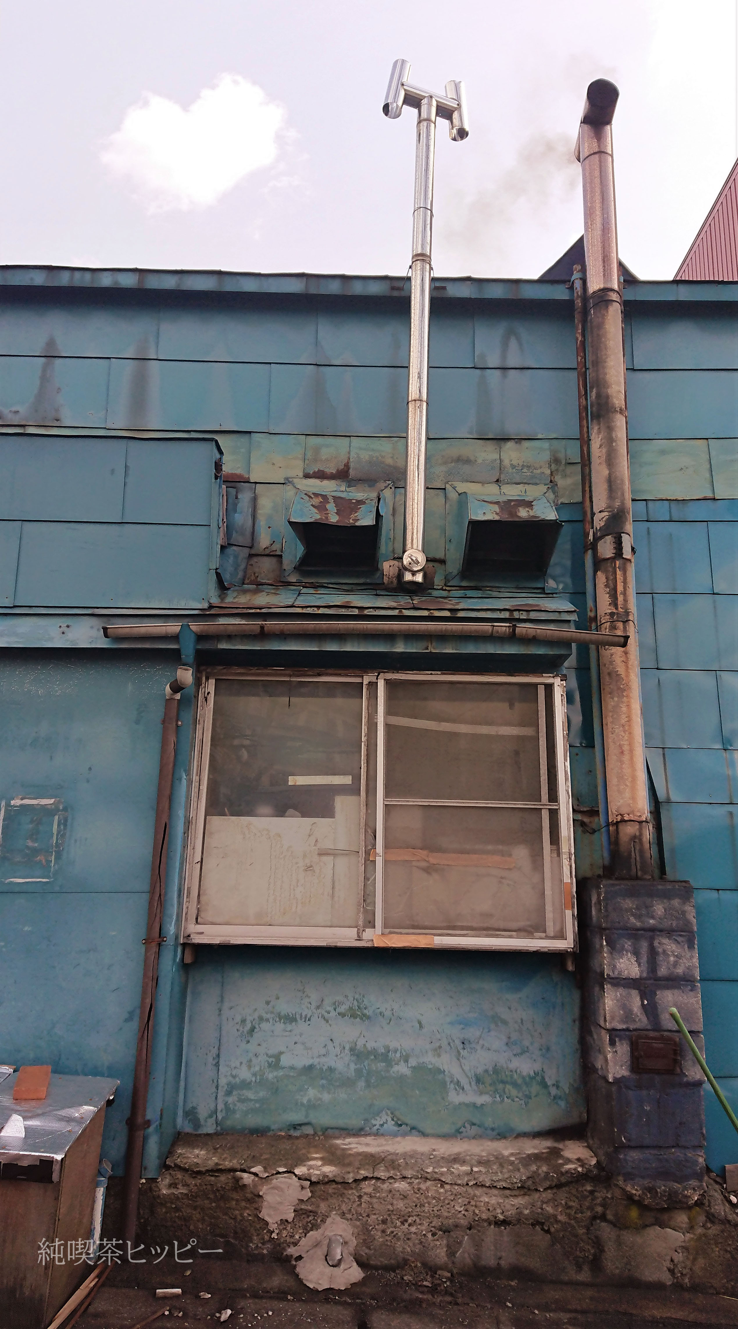 トタンの家。煙突からは煙が流れています。