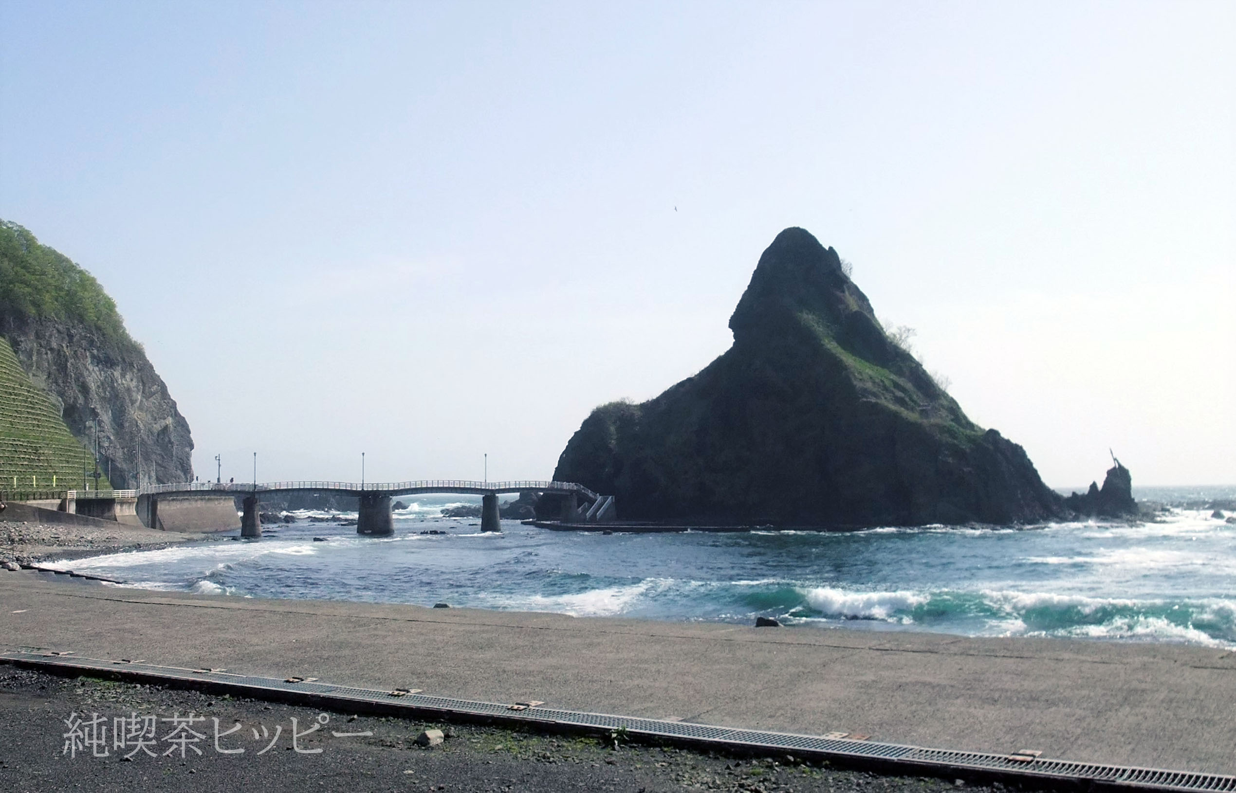 架け橋のような遊歩道があり、岩だらけの小さな山のような弁天島に渡れる。