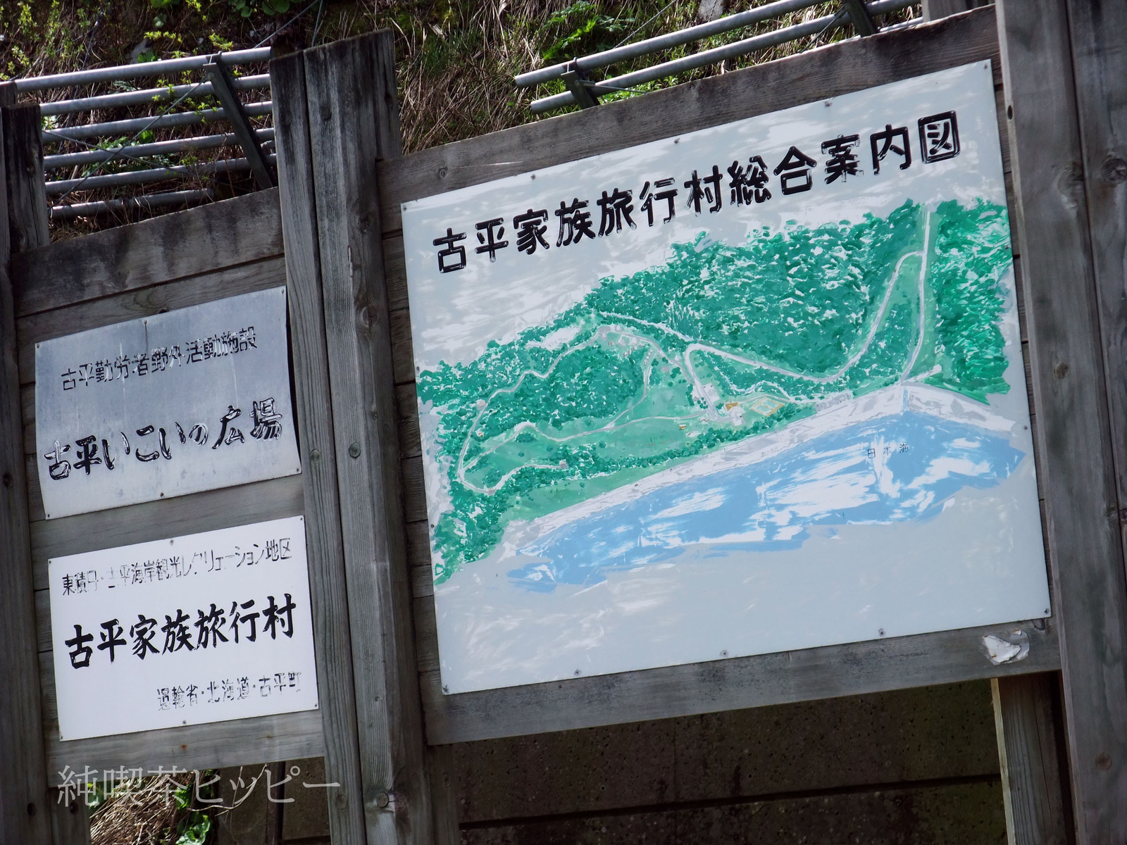 車窓からも見えるこの看板は、風情あふれる手書きの『古平家族旅行村総合案内図』。