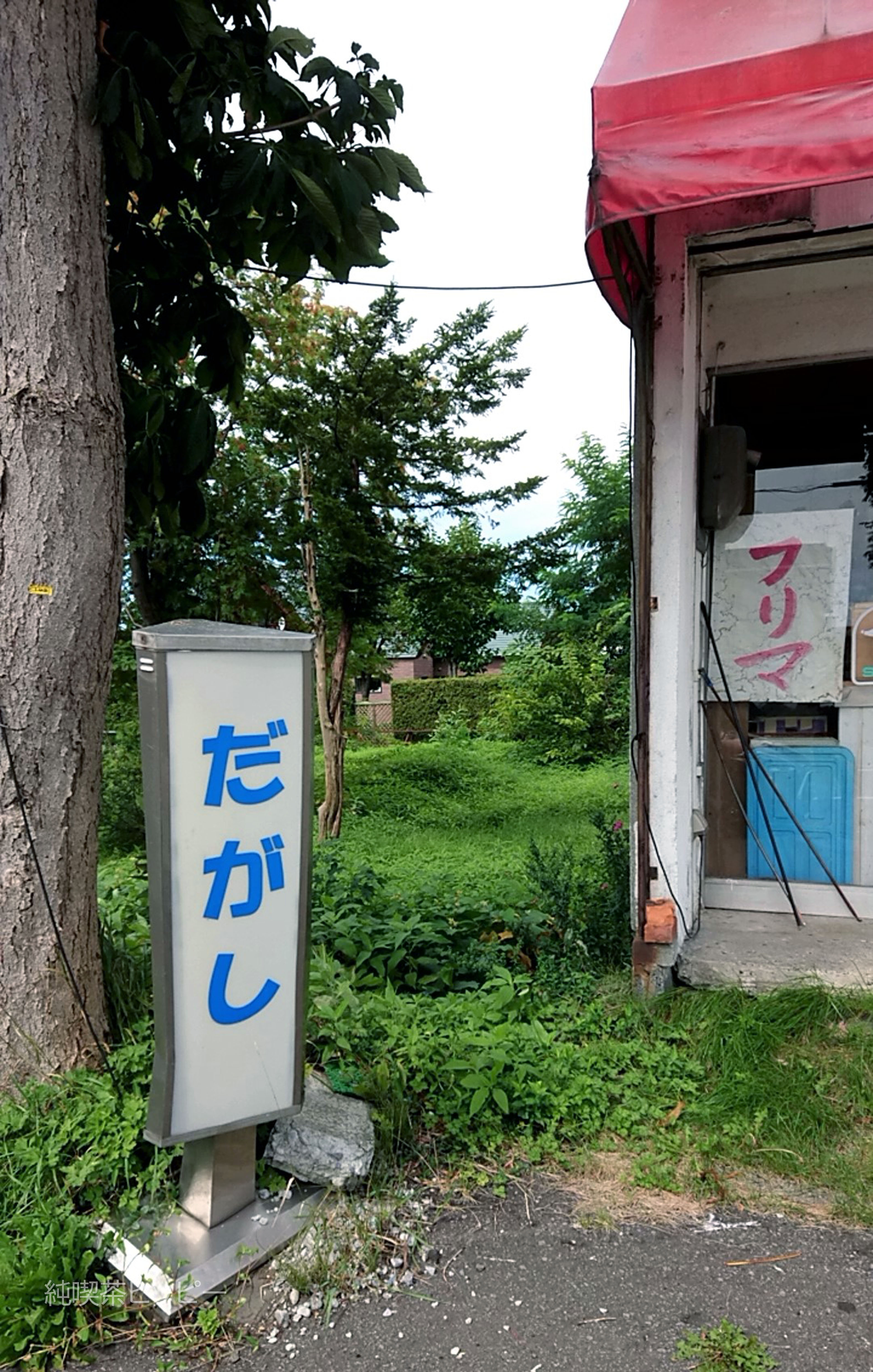 赤いテントはやぶれている代わりに、大きな筆文字で「だがし」。