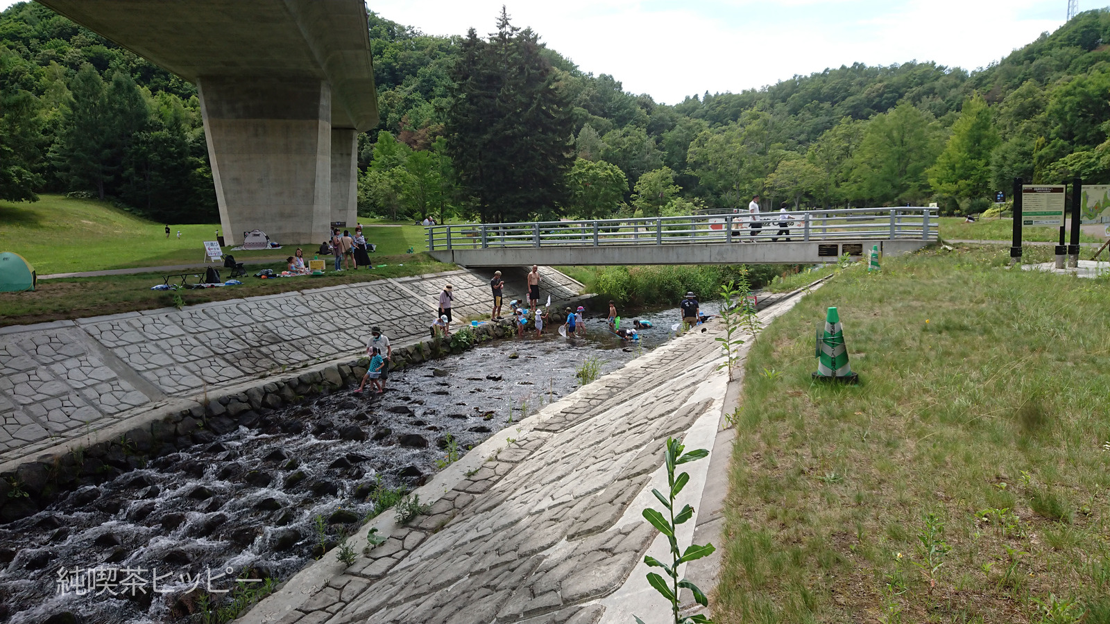 暑い日で、市民が川で遊んだり涼んでいます。
