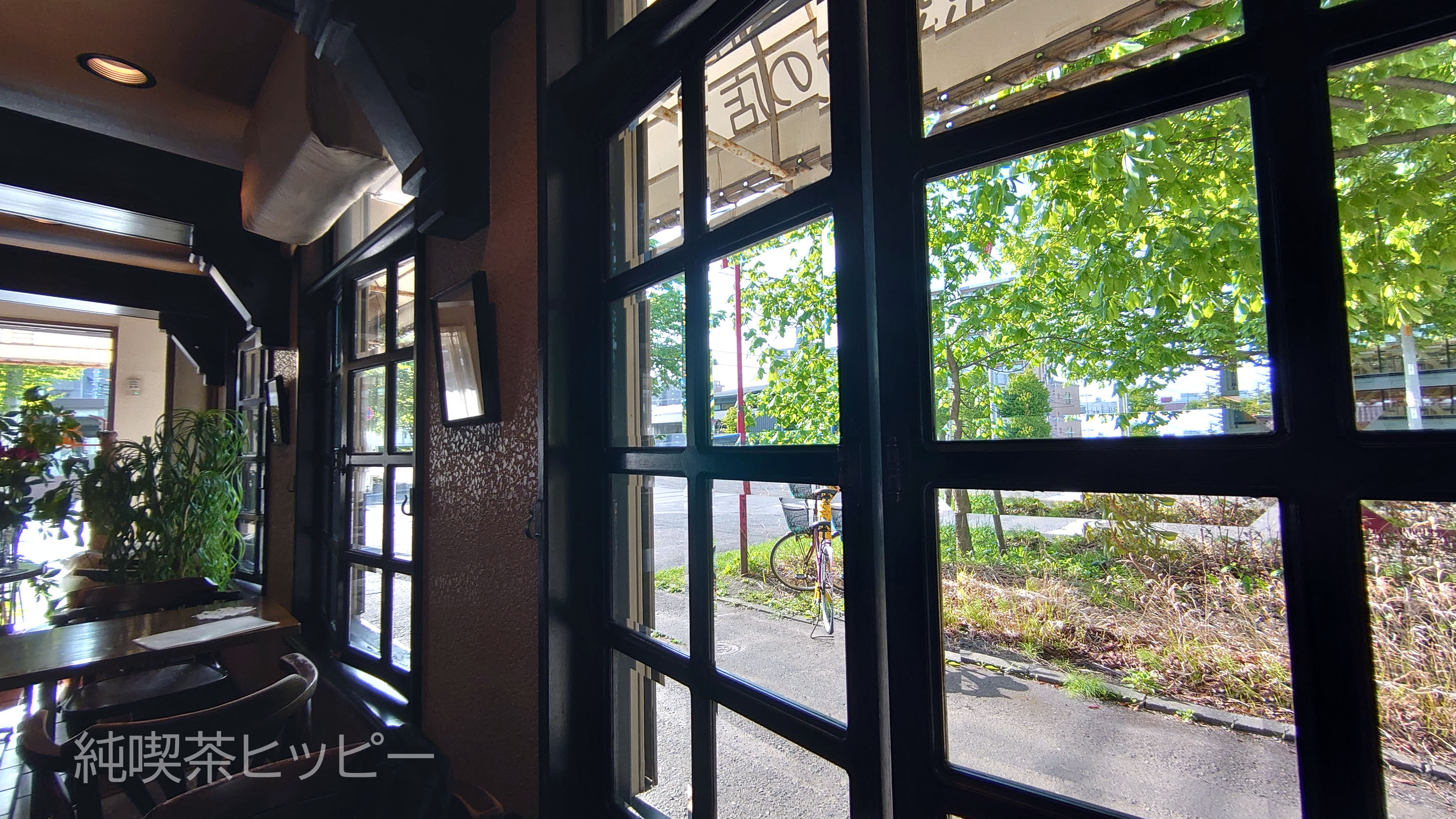 店内にたくさんある観葉植物と、街路樹の緑に癒される。
