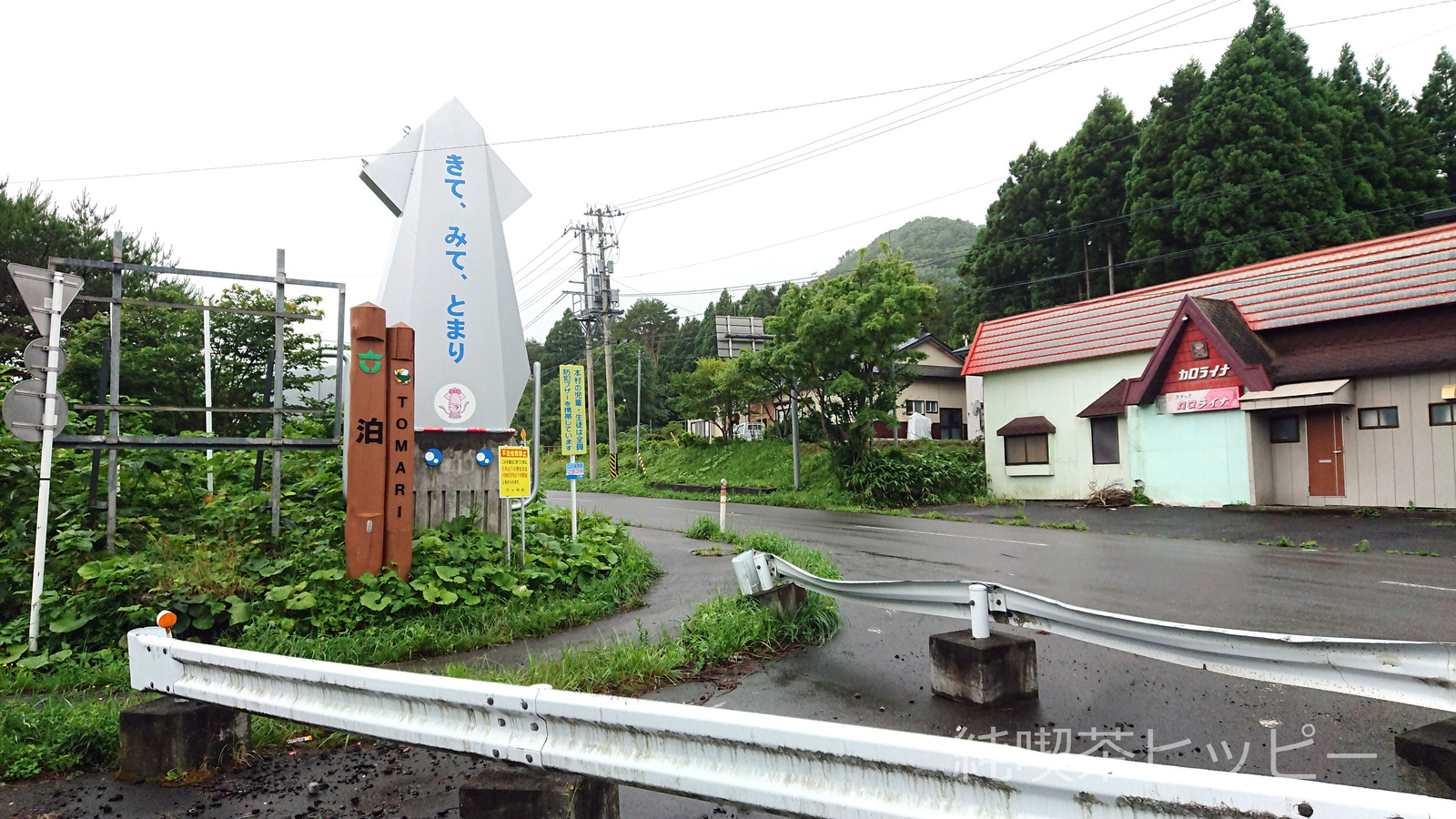 泊の道路には巨大イカ(もはやダイオウイカ)の看板がある。