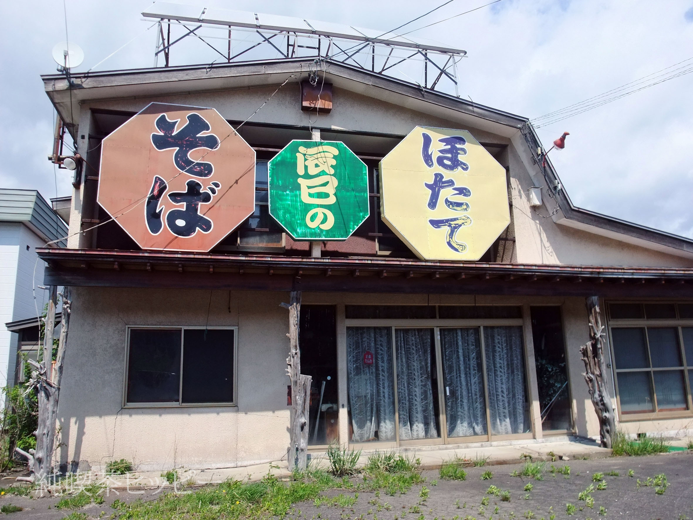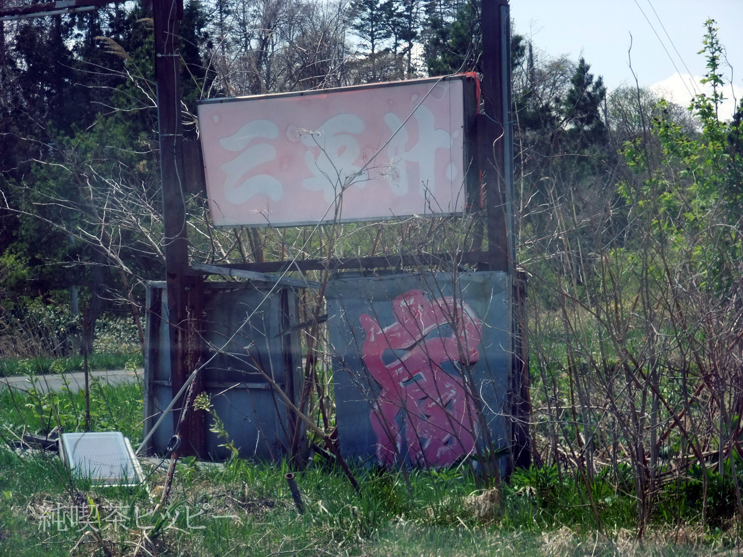 崩壊した看板。辰巳ドライブインは敷地内の食堂の横で民宿もやっていた。
