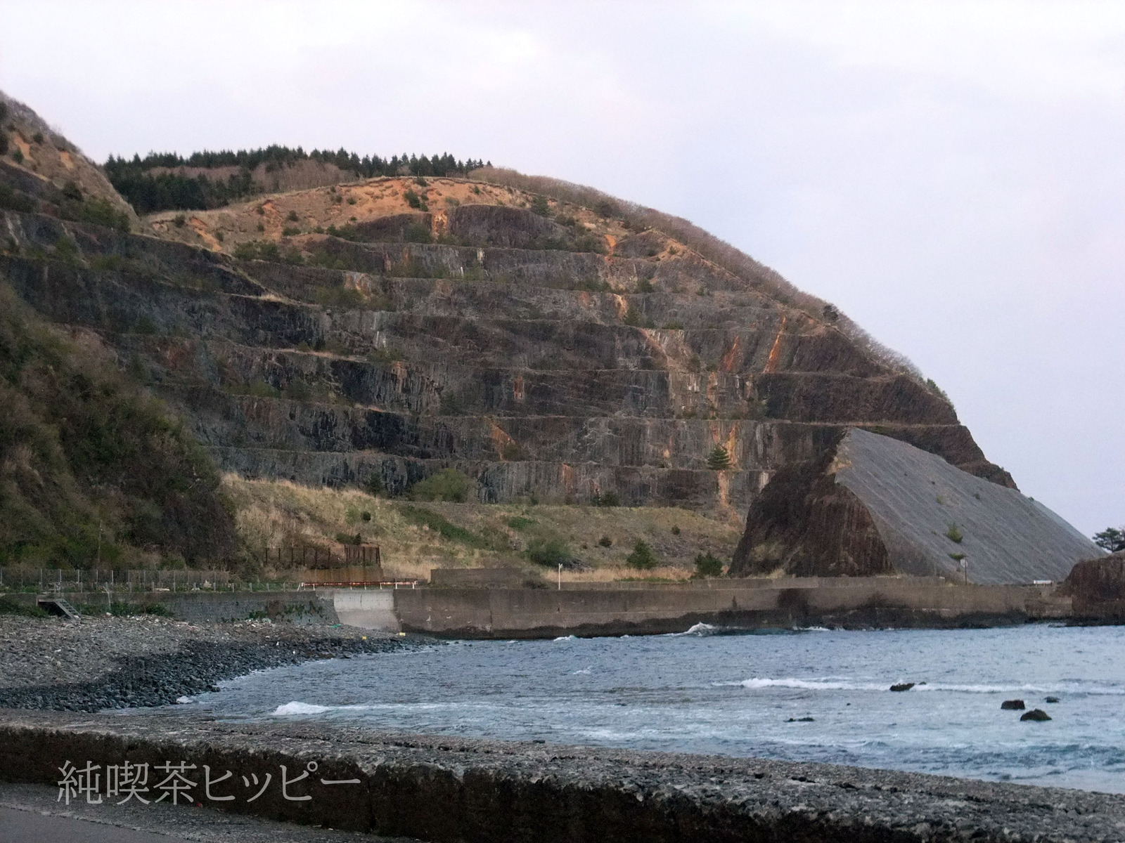 『柱状節理(ちょうじょうせつり)』の山壁が海に向かって広がる。