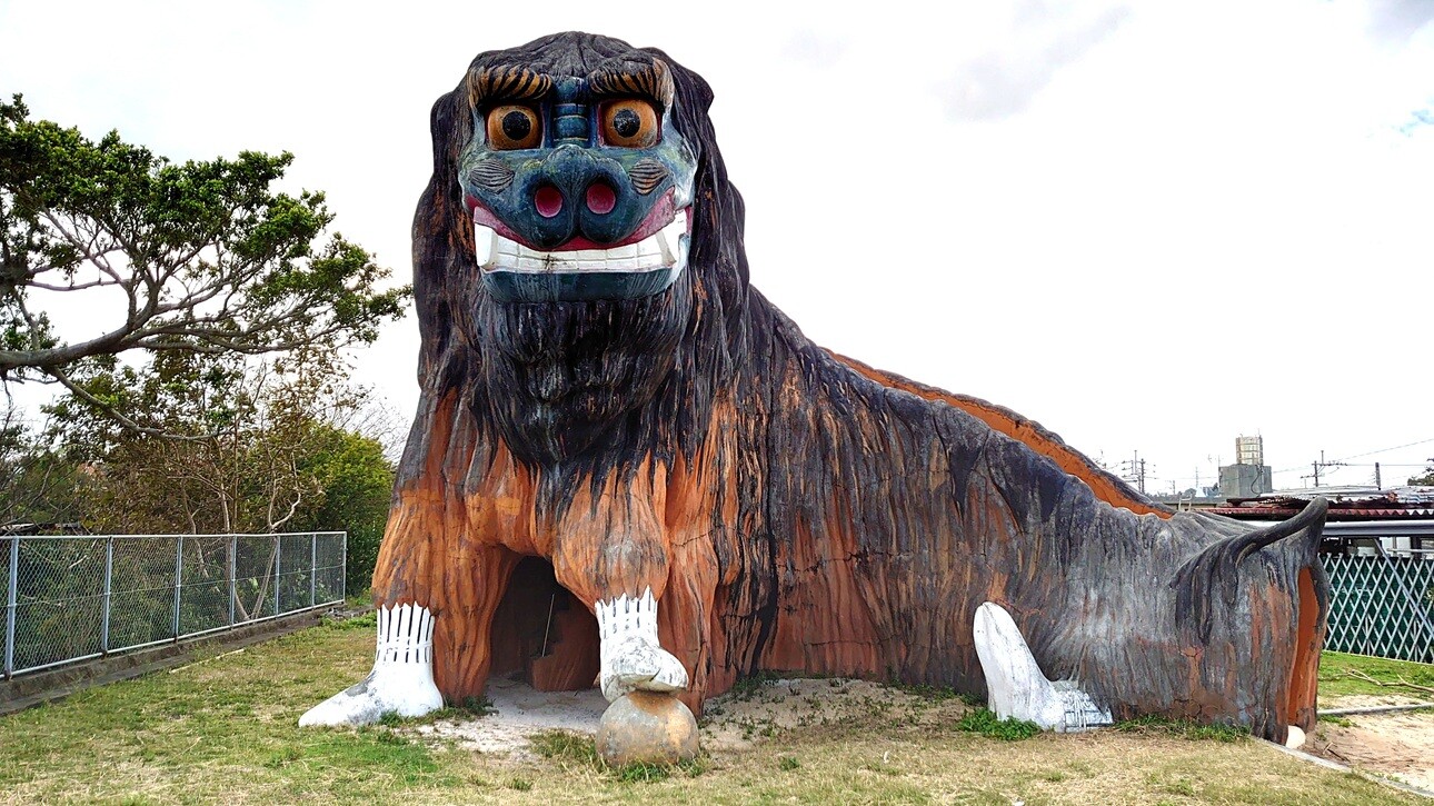 友寄馬場公園 ◆公園遊具 X Facebook LINE Pinterest コピー 2025.06.28 友寄馬場公園 沖縄県島尻郡八重瀬町友寄27 大きな獅子像であり、内部は滑り台になっている公園遊具 なんかの張り紙がある ここがバス乗り合い所だとは 階段の幅