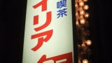 カウンターの上の昭和ポップな照明器具、陶器のビンテージな人形、店内のおちついた赤いチェア、道路の看板など欲しいものはたくさんあるが、たとえいただいてもこの店がなくなってしまうことは変わりない。それに一番欲しいのは凝った造作の天井なんだから持ち帰りはそもそも無理だ。