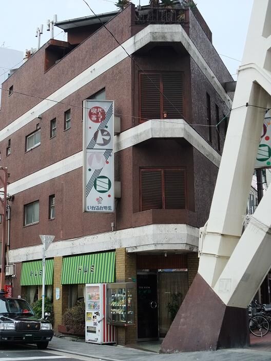 通天閣の足のすぐヨコの喫茶店は、緑のストライプのテントや看板デザインが楽しい喫茶ドレミ。スモークガラスのドアも渋い。