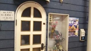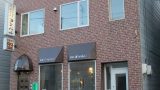 白く塗られた外壁と黒い鉄フレームにつけられた緑のテントがシャビーな雰囲気。