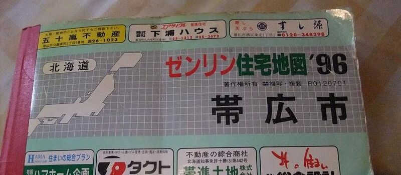ビリヤード・喫茶 ダイヤ【その④ 『白い地下』】/帯広市 ◆純喫茶【帯広市方面】 X Facebook LINE Pinterest コピー 2011.01.20 先日記事に書いた、昔立ち寄った幻のような喫茶『白い地下』について。 喫茶 ダイヤさんのご主人が覚えていた。 店にあった古い帯広市の地図を持ってきてくださり一緒にページをめくってみると・・・・・。 この地図は1996年。 思いのほか最近まで存在していたようだ。それなら駅前の区画再編前にもう一度行ってみるべきだった・・・。 ちなみに。白い地下のアーティスティックな店主はまだお元気だとか。