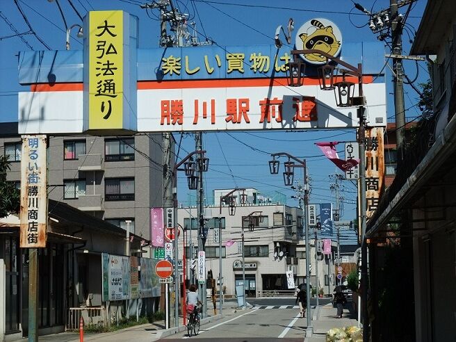 前の記事のとおり、『勝川大弘法』と一体になっている商店街で、わき道からすぐお参りにも行けます。