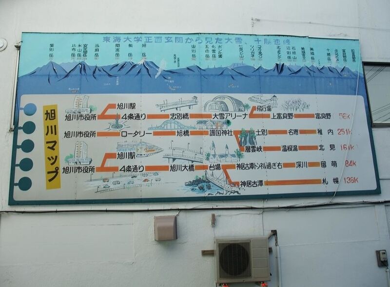 東海大学正面玄関から見た大雪、十勝連邦? ◆街の手書き看板 X Facebook LINE Pinterest コピー 2010.08.08 旭川市内の喫茶店の壁に、しかもけっこう細くて人がほとんど通らない道側に、この看板がありました。 旭川マップもユニーク。こんなマップ見たことありません。 でも、なんでここにこれが。 ?。