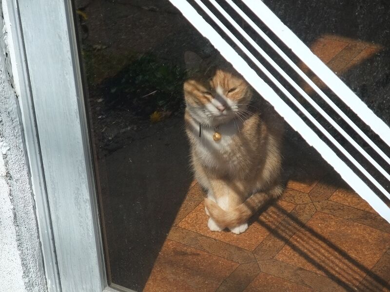 床屋さんのガラスごしにお見合い。