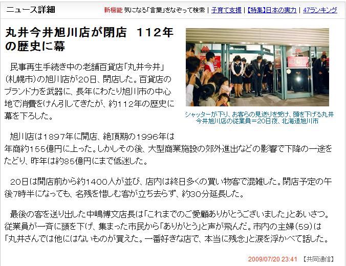 旭川丸井今井閉店から10か月。そしてユーカラ。 ◆建造物【旭川市】 X Facebook LINE Pinterest コピー 2010.05.24 2009年7月、旭川丸井今井 閉店。 1897年に開店した老舗中の老舗が撤退、それから10か月経ちましたがいまだ空きビルのまんま。 なんとかならないものか。 <閉店前日2009/07/19にケータイで撮影> 2009/07/27にケータイで撮影 そして、ここもどうなっちゃうのかな。ときどき行ったのに、なんかさびしいね。ここも昭和26年、1950年からの老舗です。