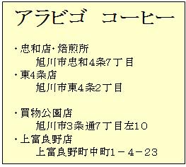 アラビゴコーヒー東4条店/北海道旭川市 ◆純喫茶【旭川市】 X Facebook LINE Pinterest コピー 2010.05.12 市民には馴染み深い1974年創業の旭川市発のコーヒーチェーン店。 豆は忠和店で焙煎されている。 ネーミングに仕掛けがあって、「珈琲(コーヒー)」ではなく「琲珈(ビゴ)」となっている。 写真は東4条店のもの。 東4条店には「ほんとにいいの?」と思うようなプレゼントがあり、 コーヒーを飲むと次回使える「コーヒー券」がもらえたりする。 つまり次回はコーヒーだけなら無料で飲めてしまうのだった。