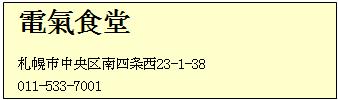 電氣食堂/札幌市 ◆大衆食堂【北海道】 X Facebook LINE Pinterest コピー 2010.05.05 かれこれ10年以上通ってる。昭和の食堂の雰囲気ではなく大げさにいうとちょっとしたテーマパーク味のお洒落?食堂。 中は暗く、芝居小屋の雰囲気。 店員さんも客も秘密の劇団員のようだ。 料理は楽しく。 たいへんうまく。 ひどく安い。 注文すると「嬉しいです!」と応える。 帰る時はだいたいスタッフさん総出で店の玄関まで出て送ってくれる。 とてもお気に入り。 この狭小スペースが私のお気に入り