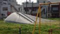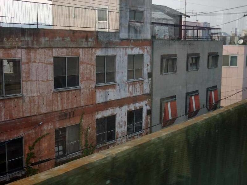 オレンジ色のテントと劣化したビルの佇まい。車窓から。