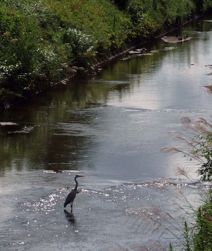 橋の上から川をながめて綺麗だなーと思っていたら、アラ大きな鳥さんこんにちは。