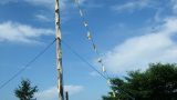 青空に昇っていくような生コンのベルトコンベア管路が、風景の中で直角二等辺三角形に見えます。