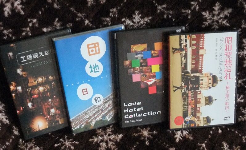 左から、工場のDVD、団地のDVD、ラブホテルのDVD、秘宝館のDVD。