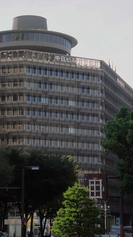 名古屋「栄」を歩いていたらひときわ目立つスーパーかっこいい建築、中日ビル様です。