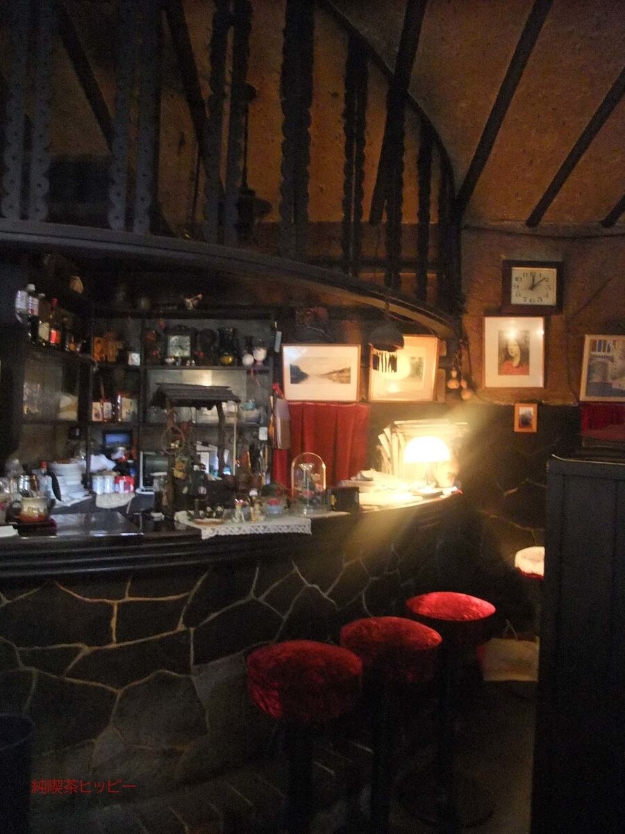 やや暗い店内の床には少し凹んだ小道がつけられ、小道のまわりには赤いベルベッドが張られたの木脚のチェアが並んでいる。