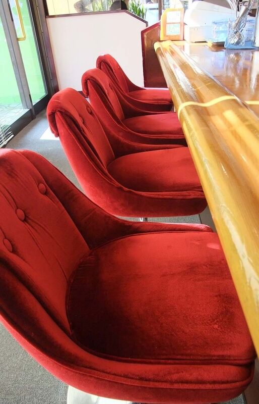 赤い生地のカウンターチェアに座ります。