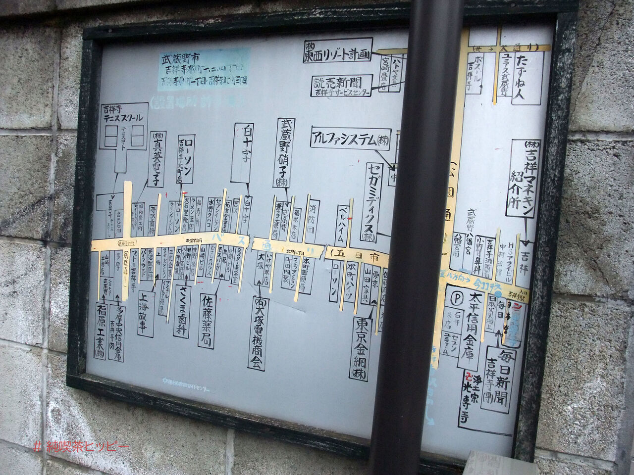 すると、歩道でこんな手書きの街案内看板を発見。前回気が付かなかったなー。