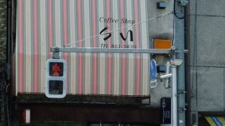 向こうの濃い赤いテントのひさしが喫茶タニ。