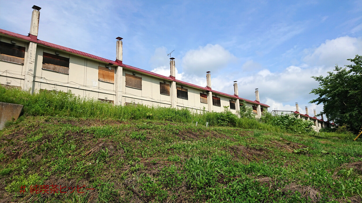 三笠市、1129号線を走ると鉄道村の手前にこのような炭住が並んでいる。道路より少し高台に位置している。