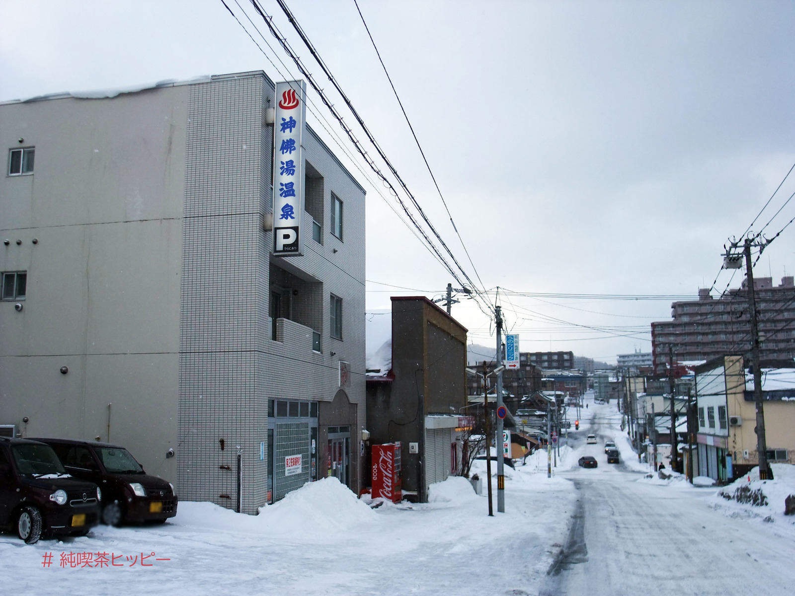神佛湯温泉に挟まれるように立っている古い建築。現在はプリンの店が入ってるけど、いわゆる「看板建築」で、もともと何だったのかな。