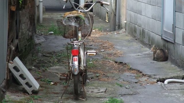 廃墟通り・廃屋通りみたいな路地があって。そこで、真っ黒な猫くんや、散らばったおもちゃ、や。足利市。
